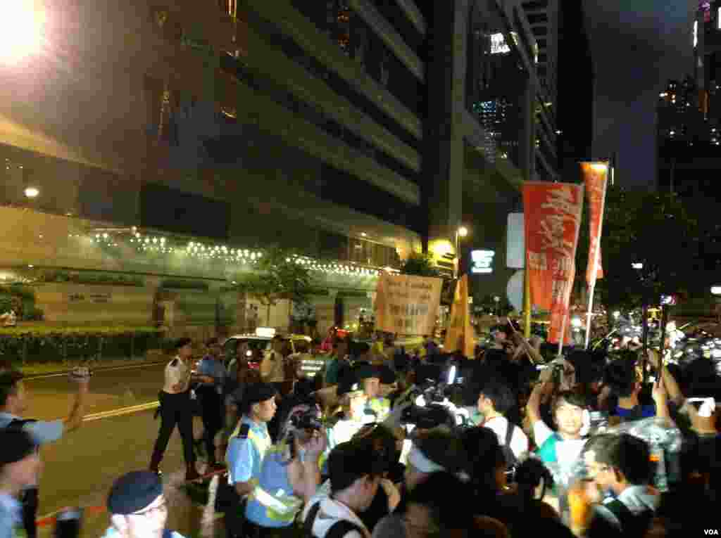 在香港泛民和占中运动在特区政府总部外的添马公园举行的有近万人集会后,数以百计的学生和市民游行前往人大常委会副秘书长李飞下榻的湾仔君悦酒店,要求与李飞对话,抗议人大常委会对香港政改全面落闸......以下是美国之音记者海彦从现场拍摄的照片。