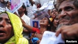 大楼是在4月24日坍塌的。当局说,他们感到辨认尸体的工作越来越难。他们说,很多时候要依靠死难者口袋里找到的身份证和手机来进行辨认。